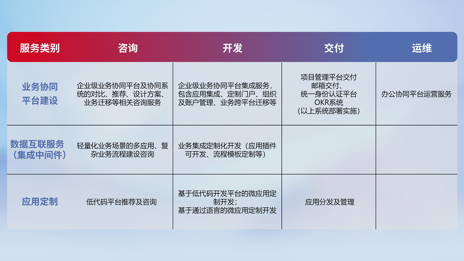 针对钉钉、、、企微、、IDaas等平台级产品提供产品的规划、、方案、、、交付、、定制化开发等服务,,实现如统一协同办公、、、、智能客户服务、、、混合会议管理、、、智能数据查询、、等业务场景,,,,实现数字化转型。。。